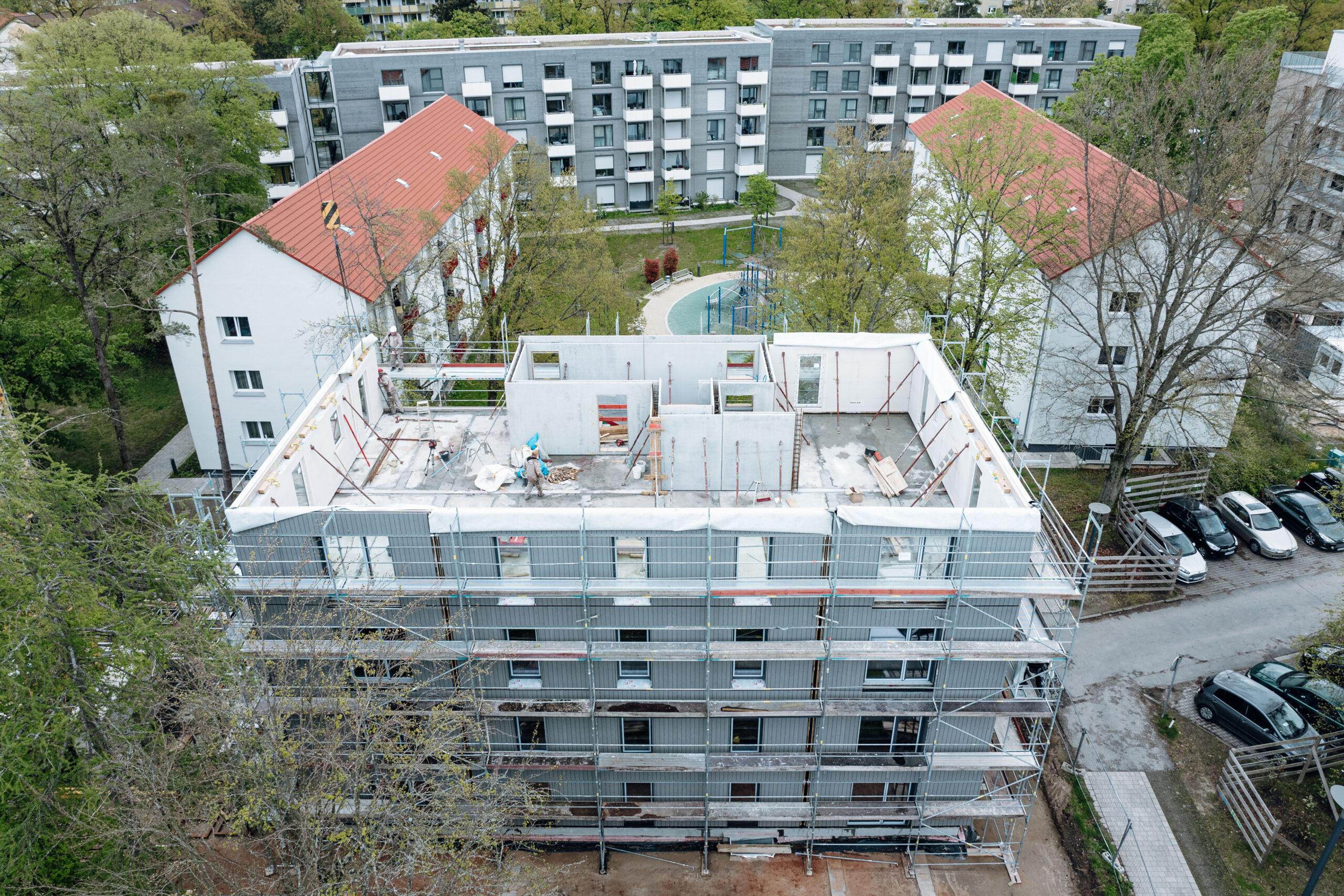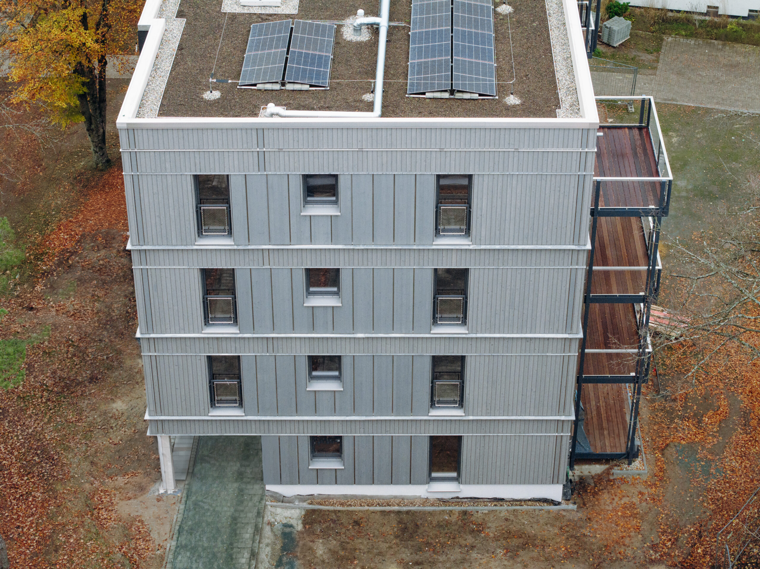 Im bestehenden Wohnquartier Jaminpark in Erlangen war eine möglichst zügige Bauweise gewünscht, bei der durch eine deutliche Reduktion von Baustellenlärm und -schmutz die Belastung der Anwohner so gering wie möglich gehalten werden sollte. Mit den beiden Holzhybriden und ihren insgesamt 19 Wohneinheiten, die in nur elf Monaten errichtet wurden, konnten diese Vorgaben voll erfüllt werden.