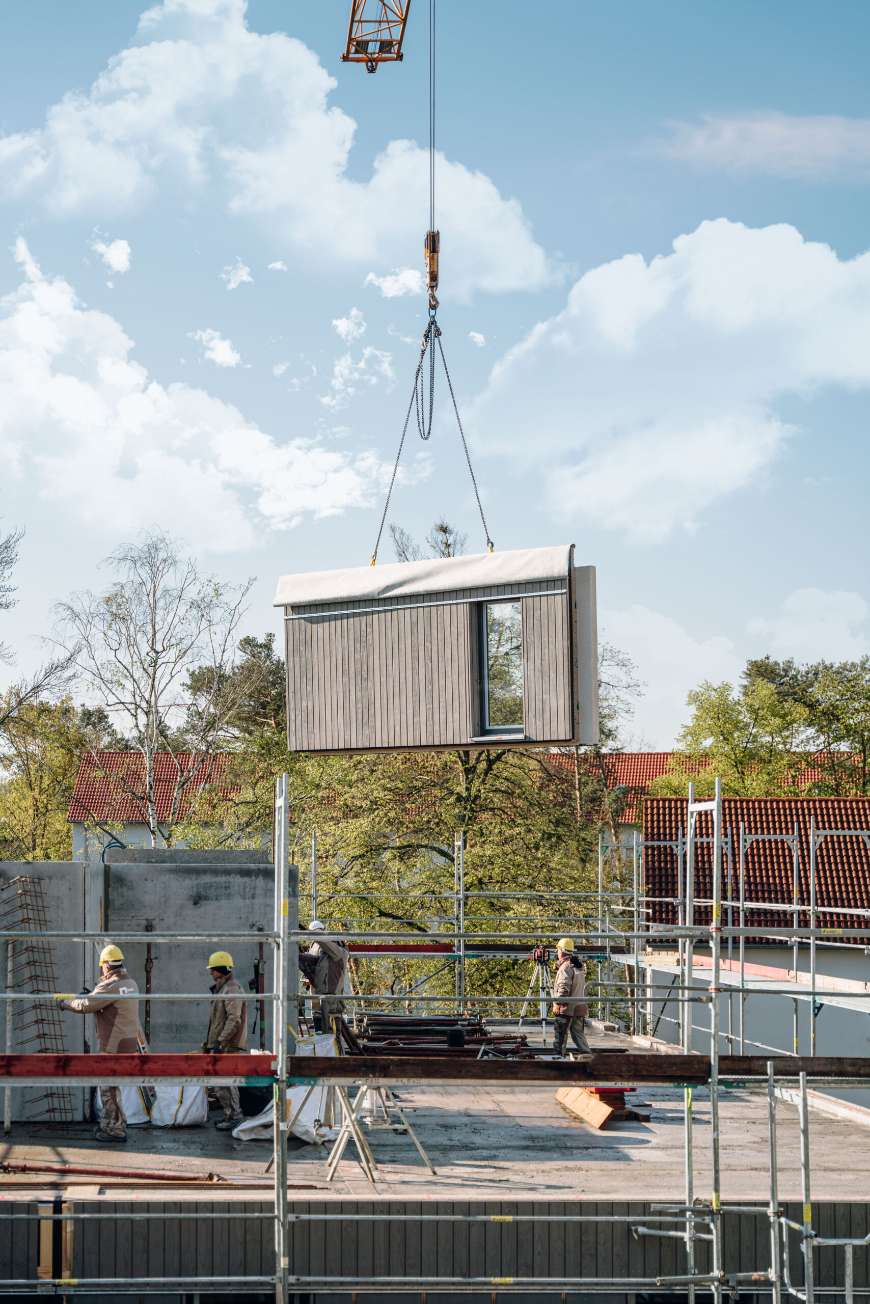 Ausschlaggebend für die Schnelligkeit auf der Baustelle war vor allem die Verwendung von vorgefertigten Holzwandelementen aus hauptsächlich Märkischer Kiefer, die im eigenen Fertigungswerk für Holzwand- und Fassadenelemente in Frankfurt (Oder) komplett vorproduziert werden – inklusive Fenstern, Dämmung und Schalung – und die die Baustellen in ganz Deutschland termingenau erreichen. In nur einer Woche konnte so in Erlangen pro Systemhaus ein gesamtes Geschoss hochgezogen werden – mit fertiger Decke, Wänden und Fassaden und sogar inklusive Komplettbädern. Denn auch die Badzellen werden unternehmensintern unter höchsten Qualitätsansprüchen vorproduziert. Der hohe Vorfertigungsgrad der Systemhauselemente führt vor Ort nicht nur zu einer enormen Mangelquellenreduktion – auch die Zeit, die haustechnische Gewerke in klassischer Bauweise auf den Baustellen normalerweise benötigen, kann je Wohneinheit um beeindruckende 80 Prozent gesenkt werden.
