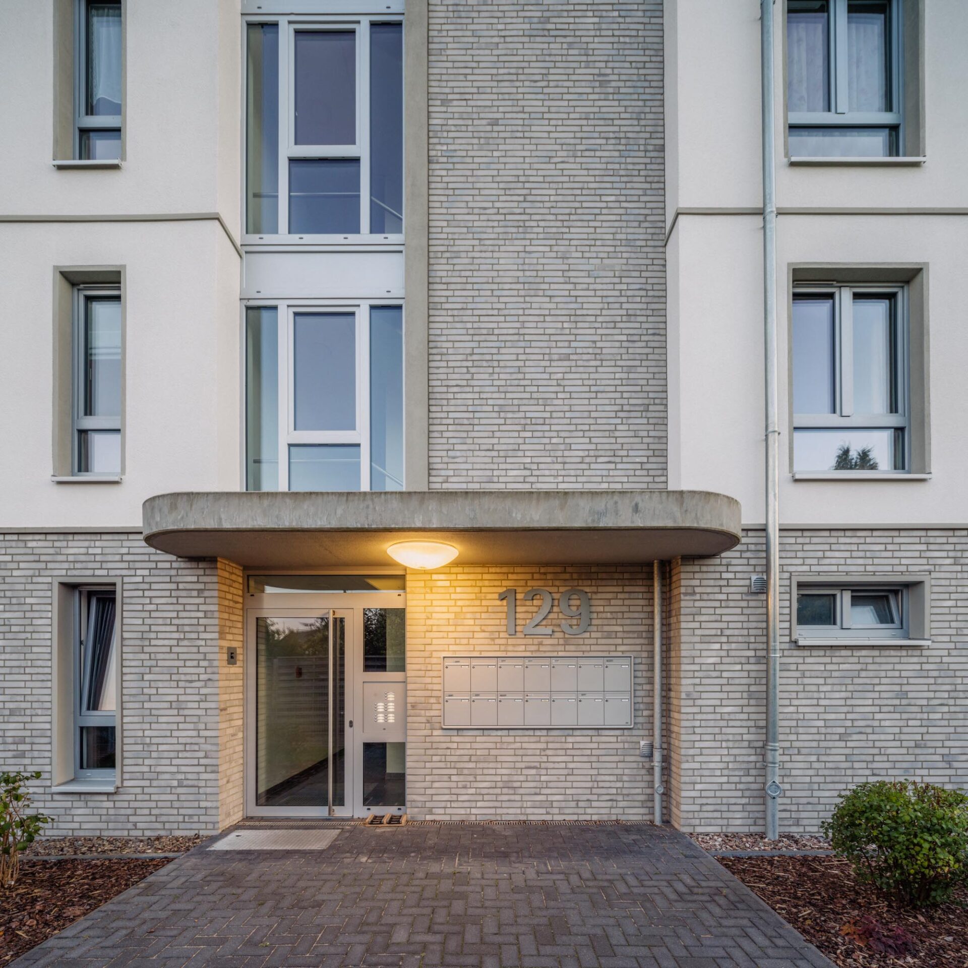 - Wärmedämmverbundsystem-Fassade, im Erdgeschoss mit Klinkerriemchen