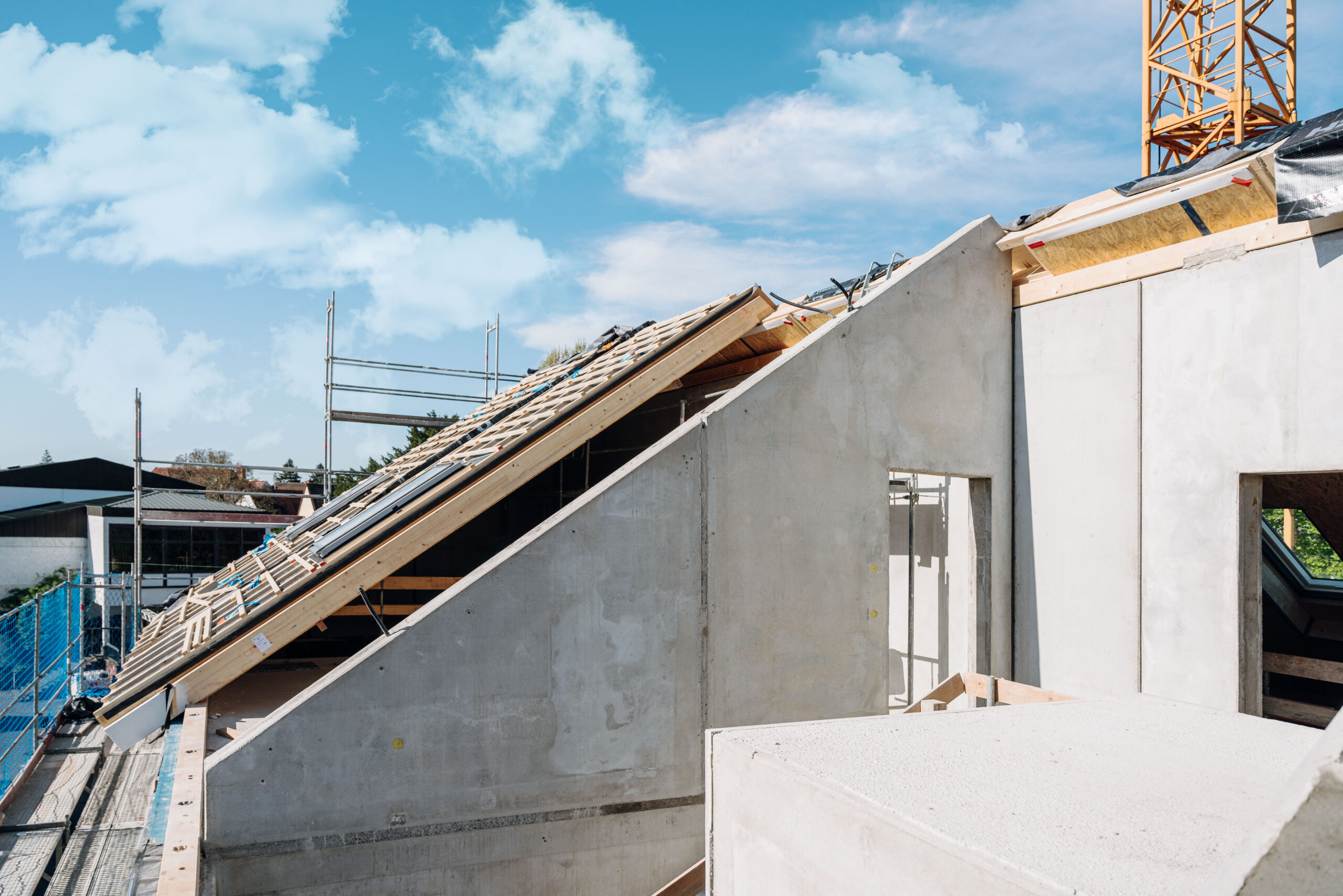 In kurzer Bauzeit entstand ein auf Kundenwunsch zugeschnittenes Mehrfamilienhaus in Holzhybrid-Bauweise mit modernen Maisonettewohnungen und einer Tiefgarage. Erstmals hat B&O Bau ein Satteldach aus vorgefertigten Bauelementen montiert, um den Bauprozess weiter zu beschleunigen