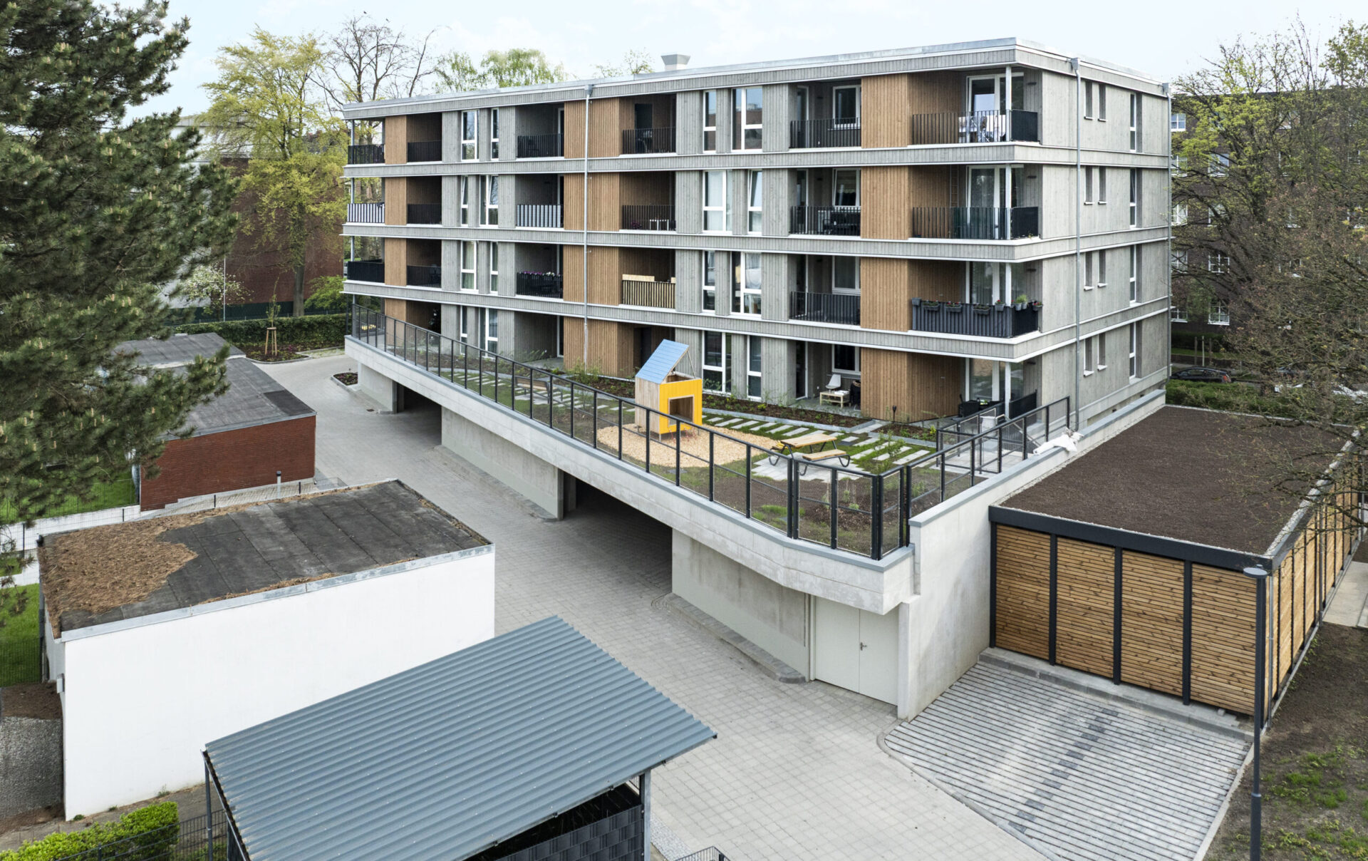 B&O Bau hat in Hamburg-Barmbek 24 neue Wohnungen über bestehenden Parkplätzen errichtet. Um bei diesem Nachverdichtungsprojekt möglichst viel Parkraum zu erhalten, wurde über den Stellplätzen ein Betontisch erreichtet, auf dem das viergeschossige Mehrfamilienhaus aufgeständert wurde.