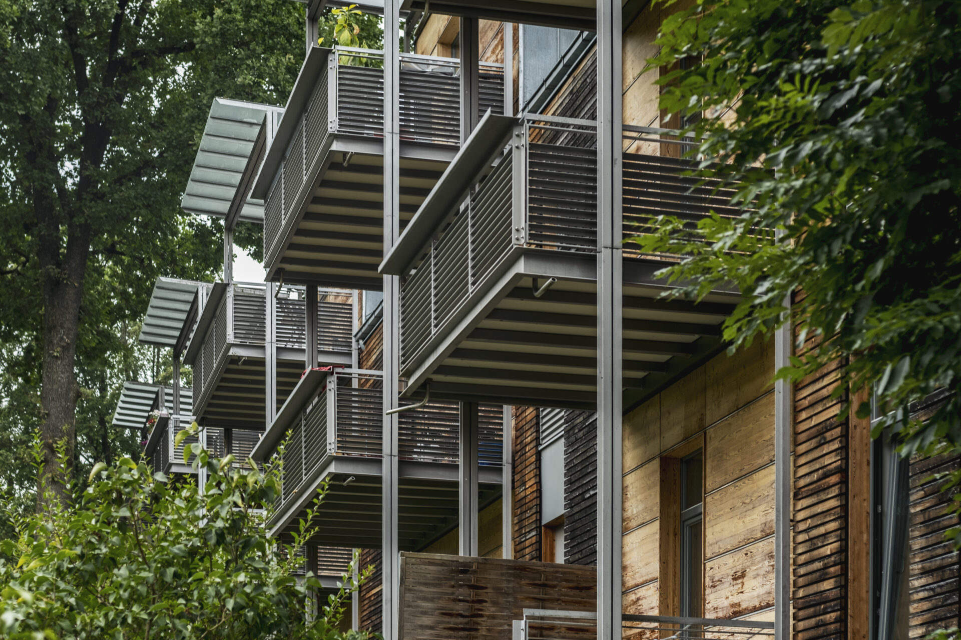 Kern des Konzepts waren passgenau vorgefertigte Holzrahmenwände mit integrierter Dämmung und bereits eingesetzten Fenstern. Ergänzt wurde die neue Gebäudehülle durch eine „Aktivfassade“ mit mechanischer Lüftungsanlage, Wärmerückgewinnung, Wärmepumpe und einer Solaranlage auf dem Dach. Das energetische Niveau erreichte EnEV minus 30.