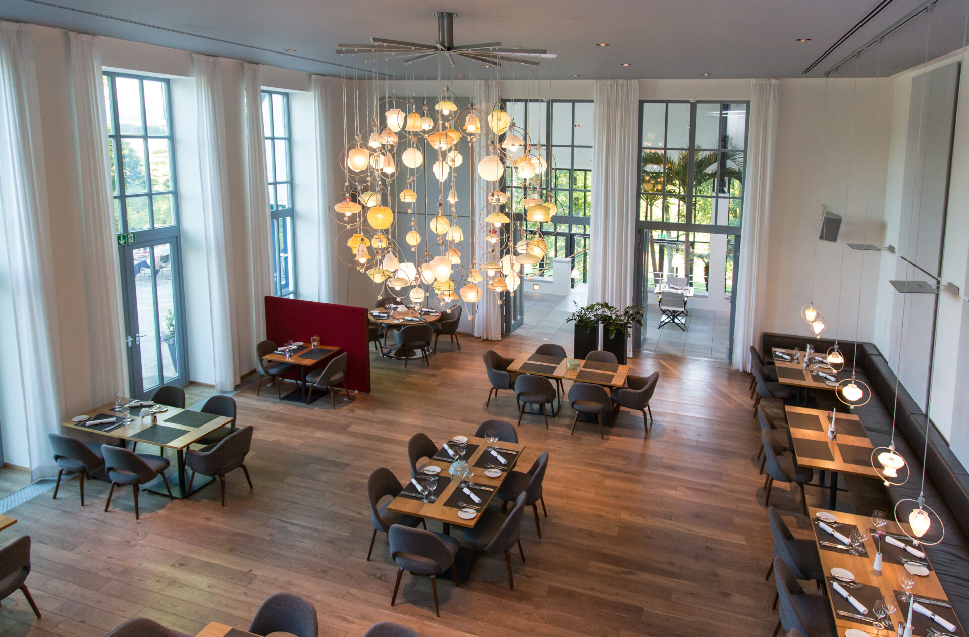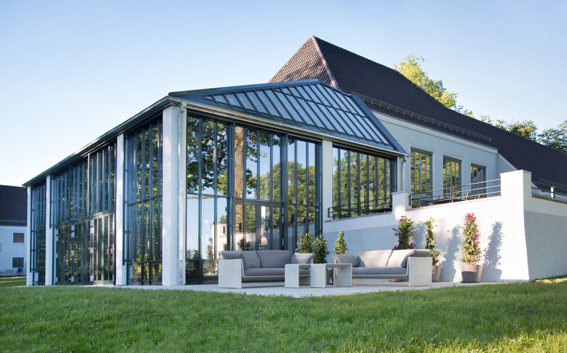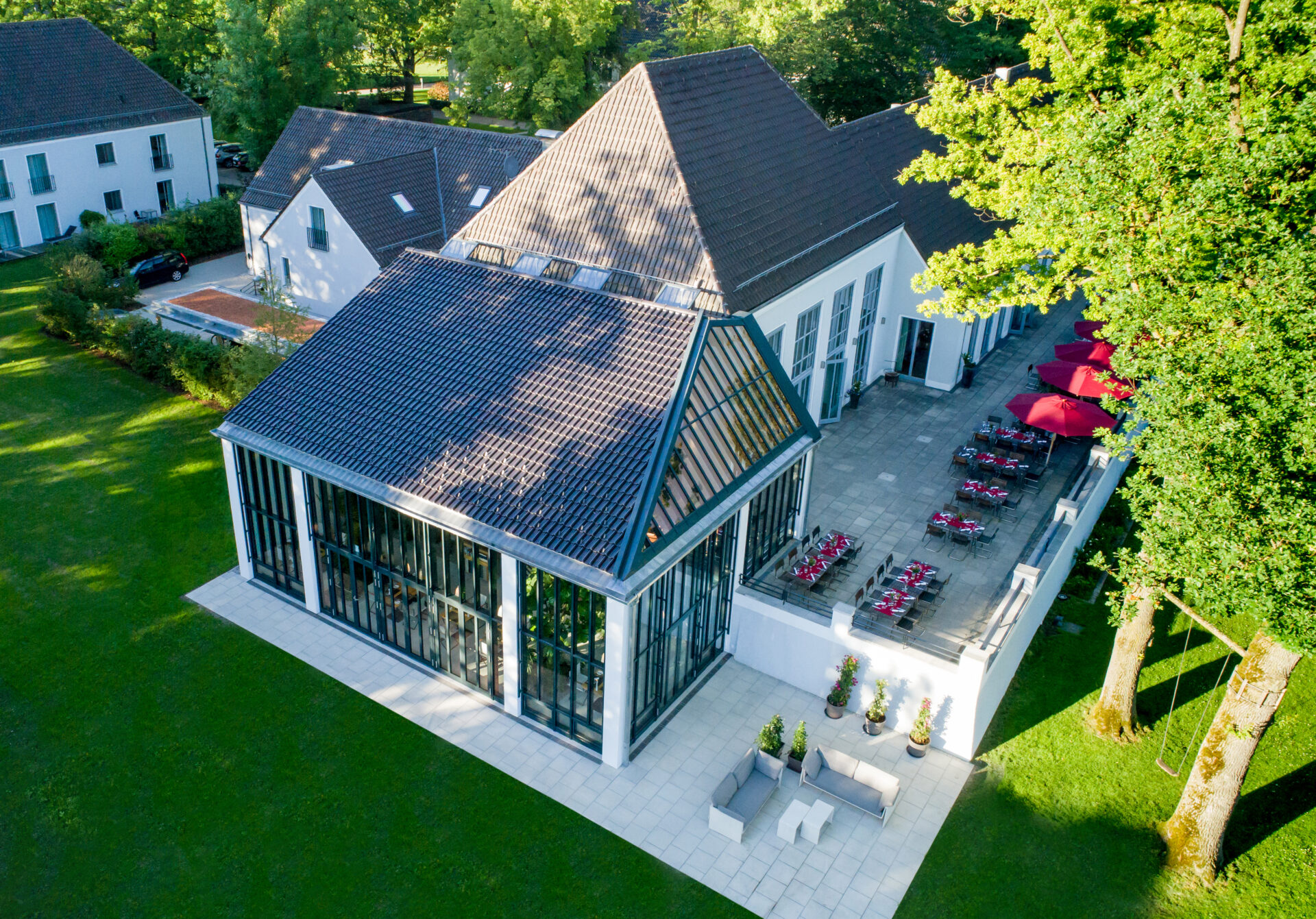 | Ausstattung | Fenster zu Fenstertüren; DG Dachterrassen; Abluftanlagen für Küche und Gasträume; Orangerie am Westteil |