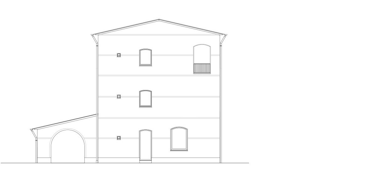 Typologie dreigeschossiges Ziegelhaus mit flach geneigtem Satteldach, monolithisch; 7 Wohnungen